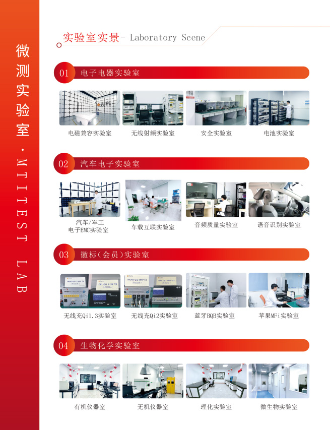 公司擁有20余個(gè)專業(yè)實(shí)驗(yàn)室,128人的工程師團(tuán)隊(duì),10000㎡檢測(cè)科技園,獲得了CNAS、CMA、A2LA、CBTL、WPC、Bluetooth SIG等授權(quán)和認(rèn)可。公司可為企業(yè)提供全球上百個(gè)國(guó)家的測(cè)試,包括華為HiCar、無線充Qi、藍(lán)牙BQB、蘋果MFi等眾多服務(wù)。無論企業(yè)身處何地,無論產(chǎn)品類型如何,微測(cè)檢測(cè)都能提供一站式解決方案,幫助企業(yè)順利進(jìn)入全球市場(chǎng)。